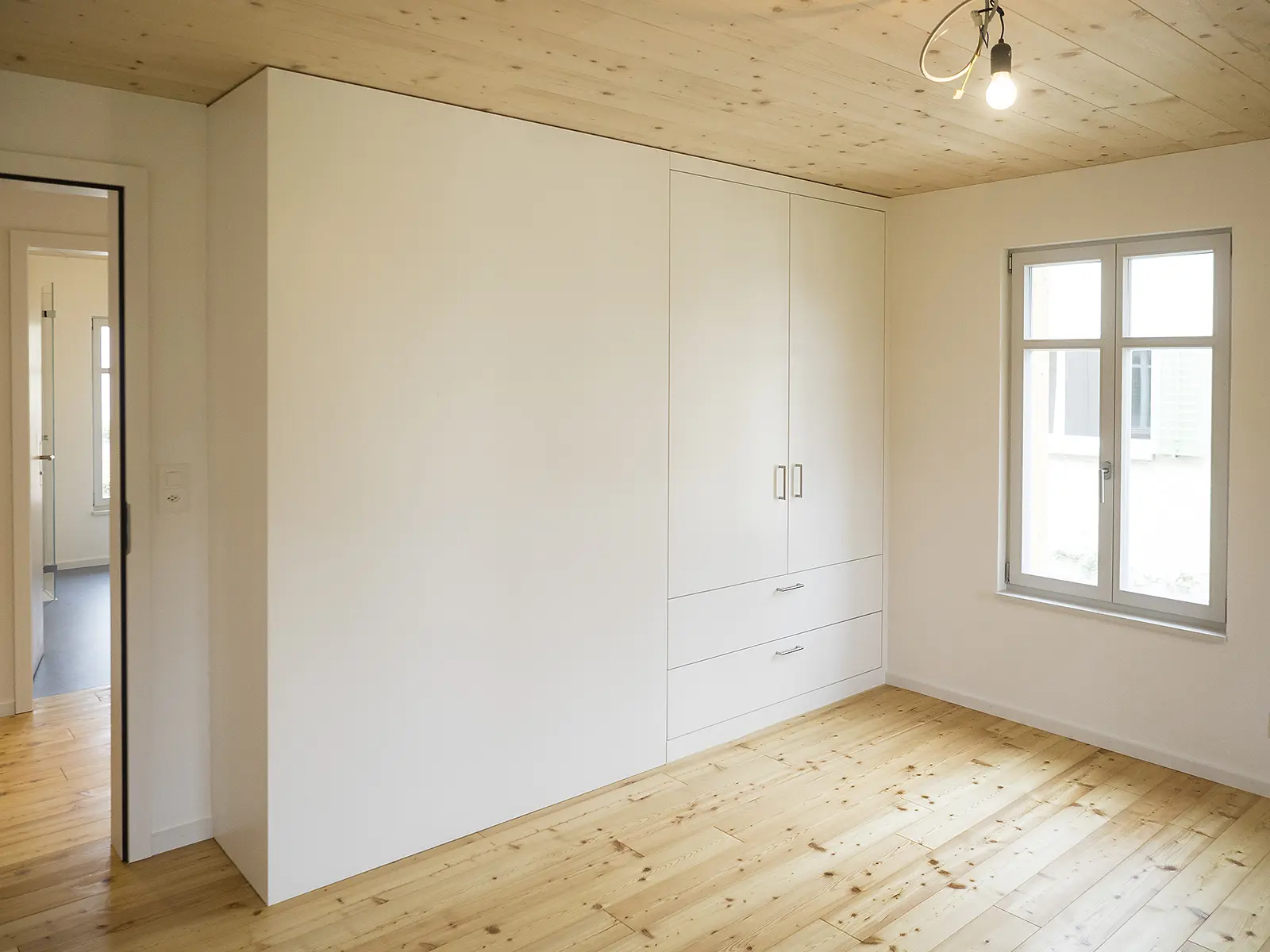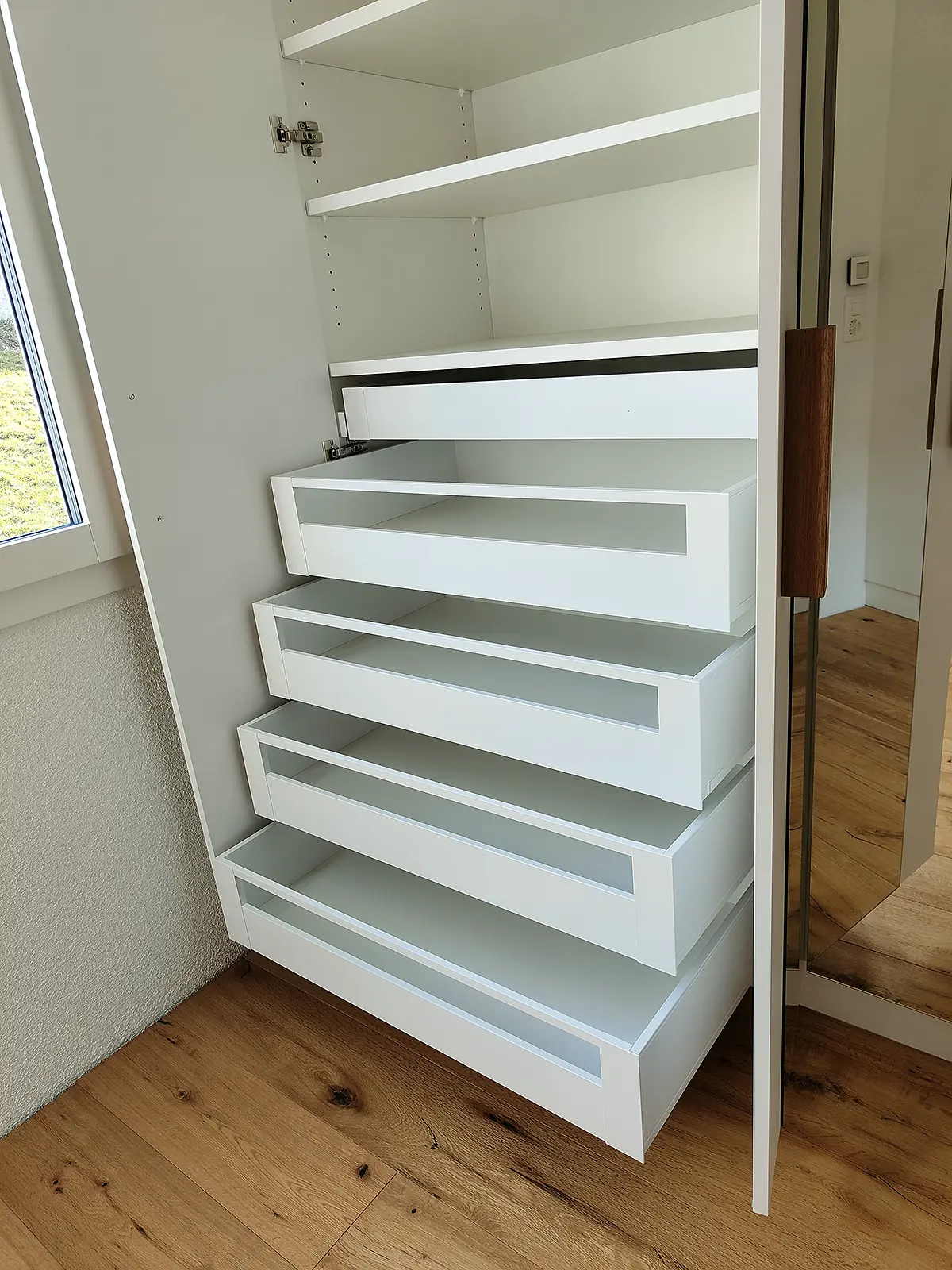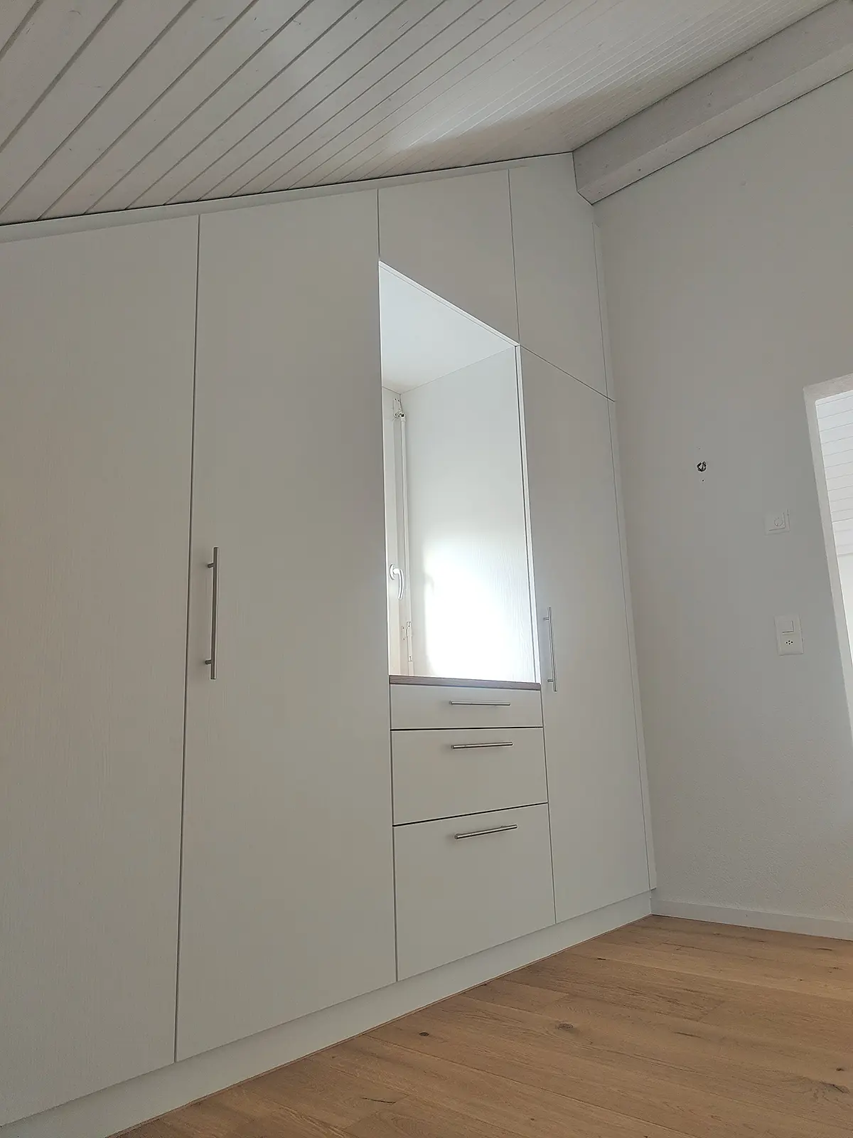 Schränke auf Mass, mit Schubladen, in Dachschrägen angepasst auf Gegebenheiten.