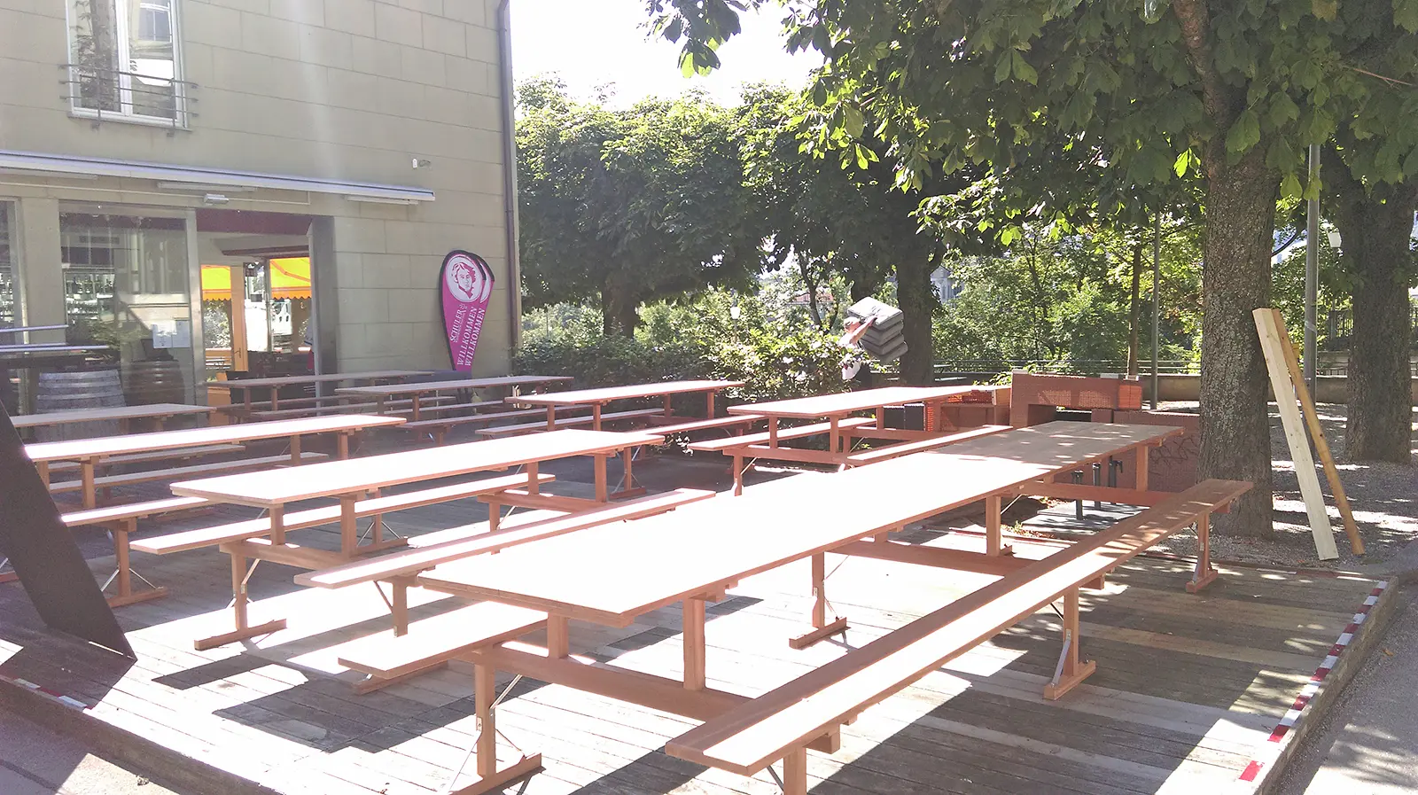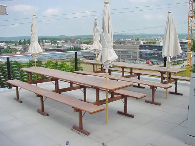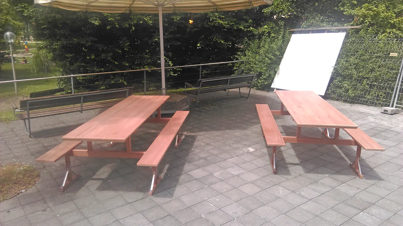 Massive Garnituren mit Holz oder Aluböcken. Dimensionen der Tische frei wählbar.